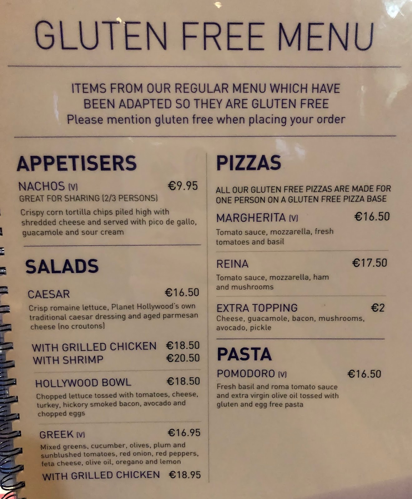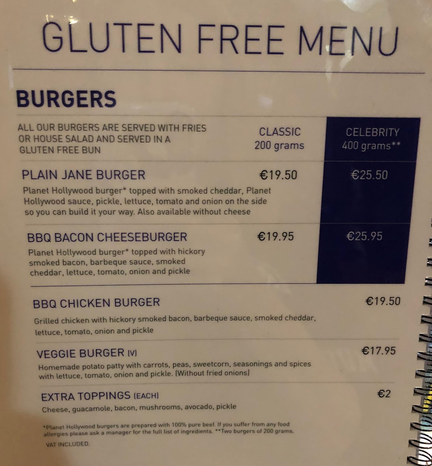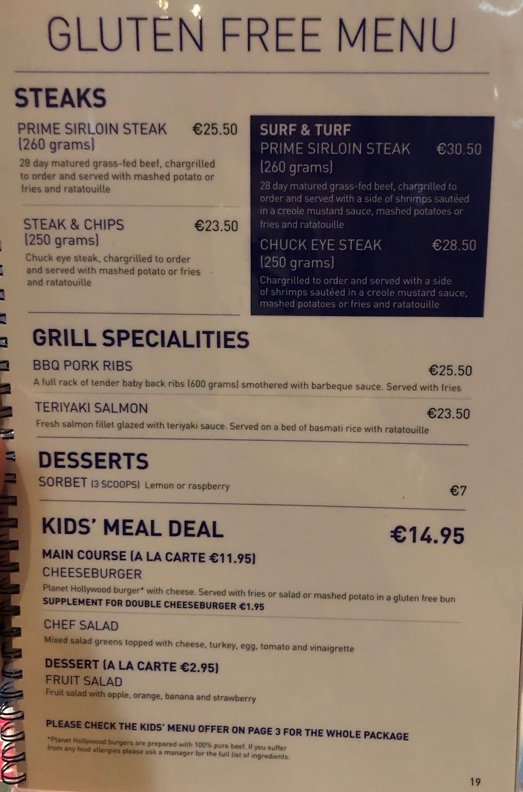 Planet Hollywood Disneyland Paris Menu Gluten Free